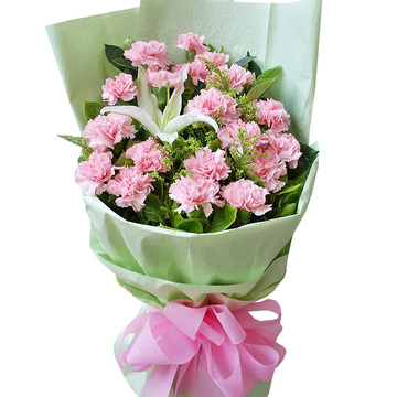 21朵粉色康乃馨,1朵白百合,黄莺、栀子叶搭配