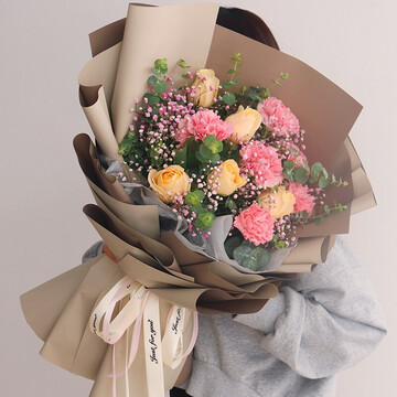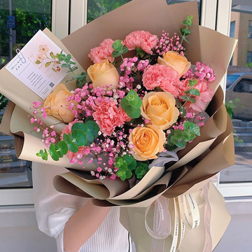 6朵粉康,5朵香槟玫瑰,粉色满天星,尤加利