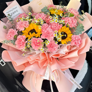 21支粉康,3朵向日葵,洋甘菊搭配,尤加利间插