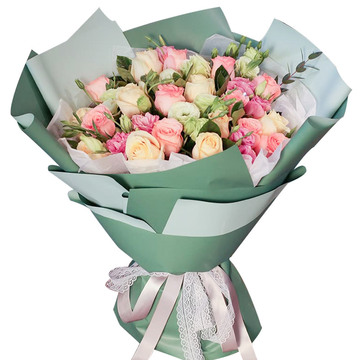33朵香槟、戴安娜玫瑰混搭,搭配桔梗、绿叶。