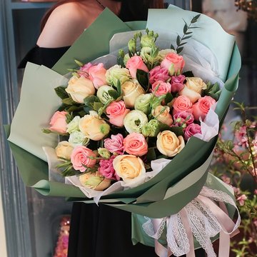 内衬白色包装纸,外层豆沙绿的硬包装纸圆形包装,粉色缎带束扎。花语:初见你的感觉是前所未有的,因为你是我的梦中情人。附送: