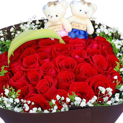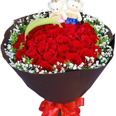 精选33枝红玫瑰,黄英满天星外围,剑叶间插,随机赠送两只小熊