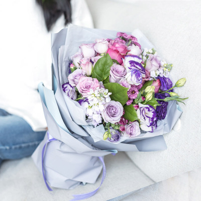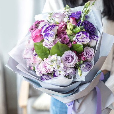 内衬白色绵纸,外层灰色雾面纸多层包装,紫色缎带扎束花语:我爱你,不是因为你是一个怎样的人,而是因为我喜欢与你在一起时的感觉。附送: