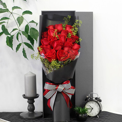 透明纸内衬,外层黑色雾面纸,配红边黑白条纹缎带系结束扎,黑色礼盒精美包装。花语:有你的浪漫,天天都快乐附送: