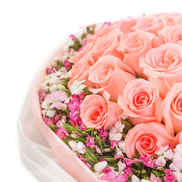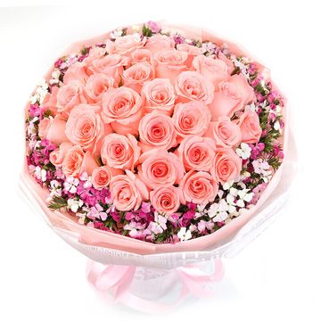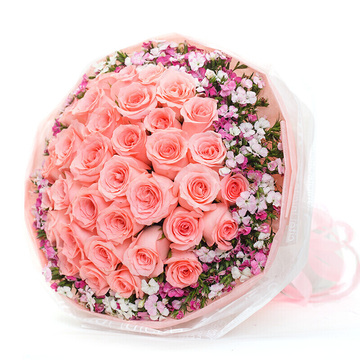 粉色包装纸内衬,白色英文雾面包装纸,粉色丝带束扎。花语:生活并不是一张白纸,因为那里有你有我,今生只为与你相逢。附送: