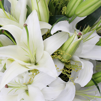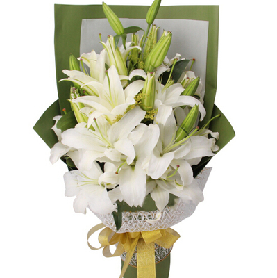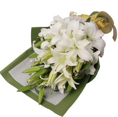 白色礼品纸加绿色礼品纸包装,蕾丝网托底,金色丝带系蝴蝶结束扎。花语:寓意百年好合诚挚祝福附送: