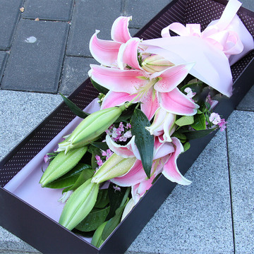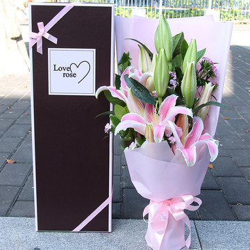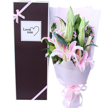 粉色雾面纸扇形包装,粉色缎带束扎,精美礼盒包装。花语:不管我在不在你身边,但是我的爱会把你包围,仰望天空,我就是那颗最亮的星星。附送: