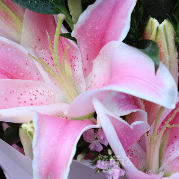 12朵粉色香水百合,黄莺,勿忘我搭配。