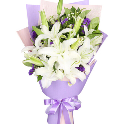 5枝多头白百合,满天星、黄莺、勿忘我搭配。