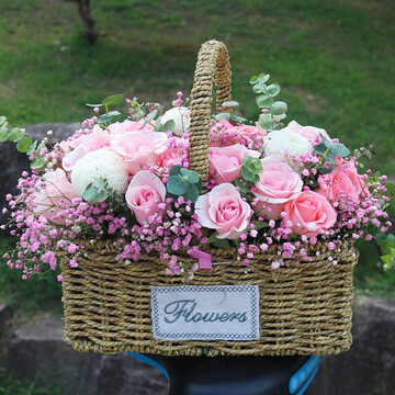 21朵戴安娜粉玫瑰,4朵白色乒乓菊,粉色满天星间插,尤加利点缀