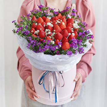 白色雪梨纸+粉色抱抱筒花语:咬一口草莓,酸酸甜甜,就好似我们的感情,甜蜜幸福。附送:
