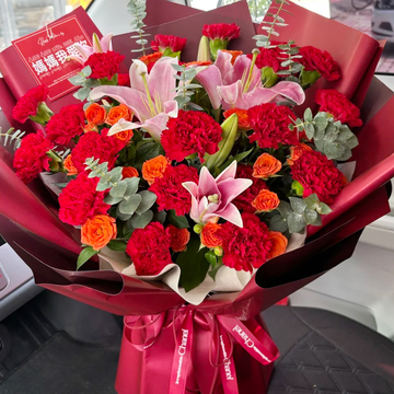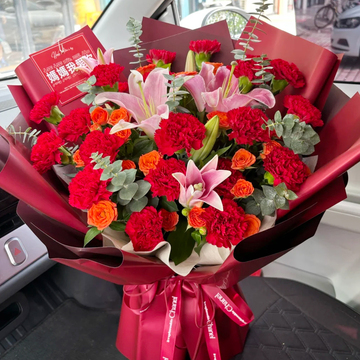 19朵粉康乃馨,2枝多头粉百合,5支橙色芭比泡泡,尤加利间插