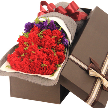 19支红色康乃馨,紫色勿忘我点缀,黄莺丰满间插