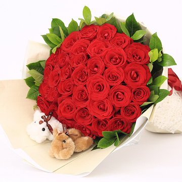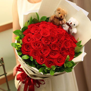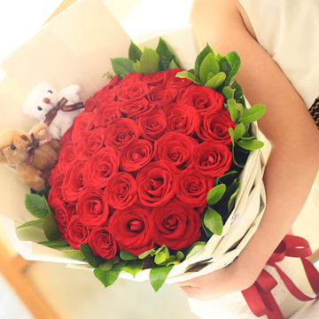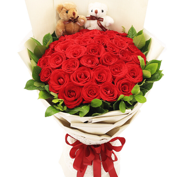 33朵优质红玫瑰,绿叶围边,2只小熊搭配。
