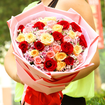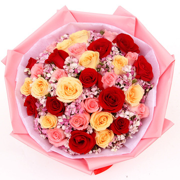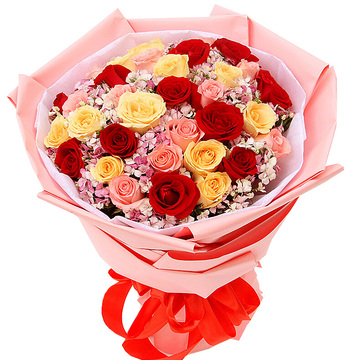 粉色卡纸圆形包装,红色丝带束扎。花语:你给我的拥抱,加速了我的心跳,幸福这般美好!附送: