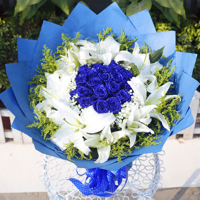 精选11朵蓝色妖姬,8朵香水百合,搭配黄莺。