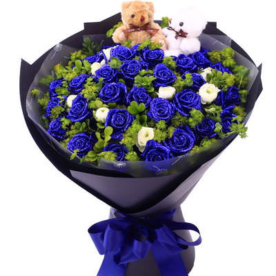 33枝精品蓝色妖姬,洋桔梗点缀,外围叶上黄金,两只可爱小熊。