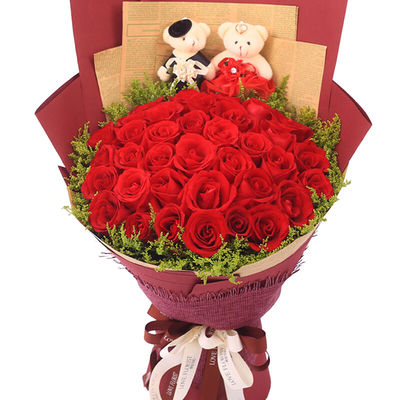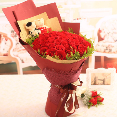 精选33朵红玫瑰,搭配2只小熊,黄莺。