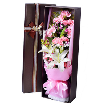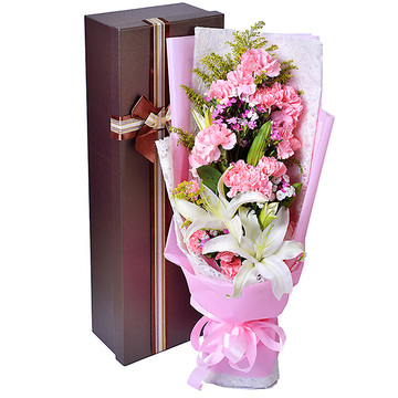 内衬白色落水纸,外层粉色雾面纸扇形包装,白色落水纸束腰,粉色缎带束扎。长方形礼盒装(颜色随机)花语:是最美的面孔,伴我拼搏争成功;是最美的笑容,伴我生命去追梦;是最美的祝福,伴我天涯向前冲。母亲节到了,愿亲爱的妈妈健康快乐永幸福。附送: