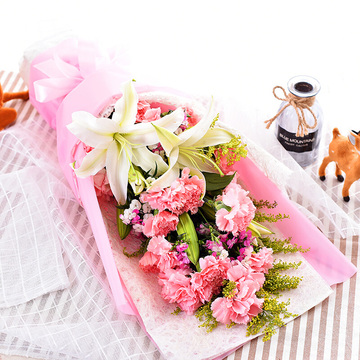 19支粉康,多头白百合2枝,黄莺点缀,粉色石竹梅间插