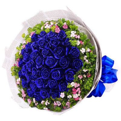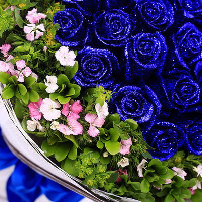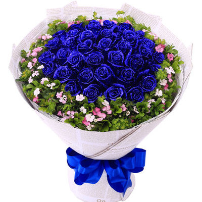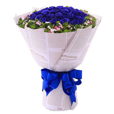 白色英文报纸包装,蓝色丝带系蝴蝶结花语:夜晚辗转难眠才明白了什么是“思念”;梦醒后才发现有一种“缘”,是“永恒”刻在心间;每次分手时频频回头的双眼,才看见无限的“眷恋”;爱你之情永不间断。附送: