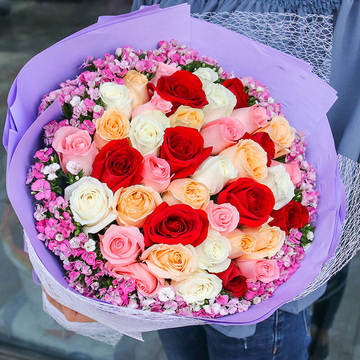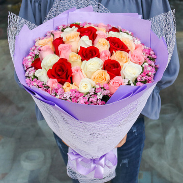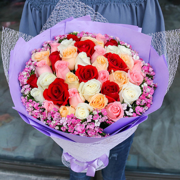 33朵混色玫瑰(红+戴安娜粉+香槟+白),相思梅围边搭配。