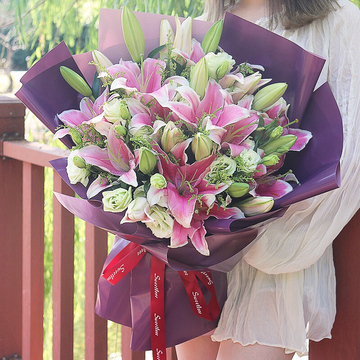 精选11枝多头粉百合,搭配白桔梗和黄莺