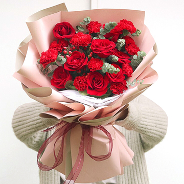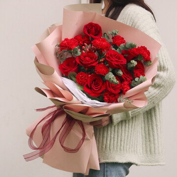 11朵红康,10朵红玫瑰,尤加利和红豆搭配
