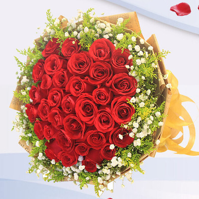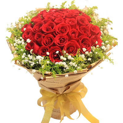 精选33枝红玫瑰,搭配适量黄莺、满天星等。