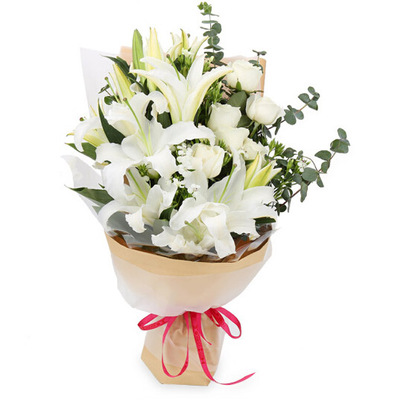 6支白百合,6支白玫瑰,尤加利叶、相思梅搭配。