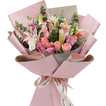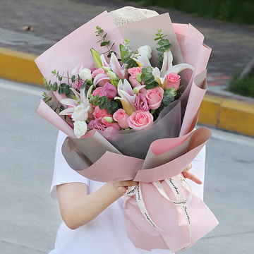 内衬透明雾面纸,外层粉色欧雅纸扇形包装,白色英文缎带束扎花语:如果再见不能红着眼,是否还能红着脸,就像那年匆促刻下永远一起那样美丽的誓言附送: