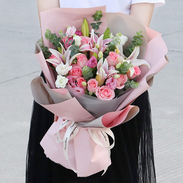 11朵戴安娜粉玫瑰,2枝多头粉百合,粉桔梗和白桔梗适量,尤加利间插