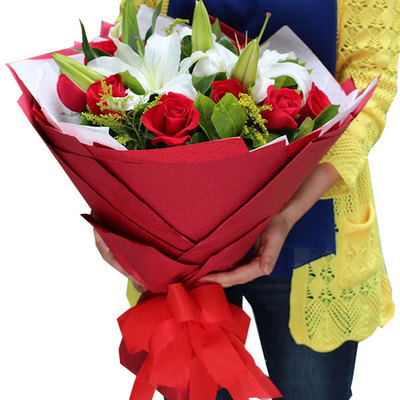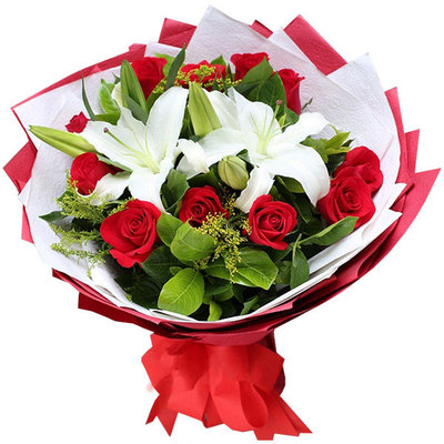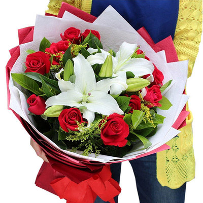 11枝红玫瑰,2枝香水百合,搭配黄莺点缀。