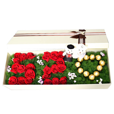 22朵红玫瑰,11颗巧克力,一对可爱小熊,搭配蓬莱松、相思梅点缀。