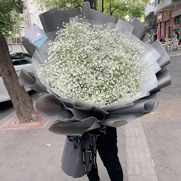 白色+灰色雾面纸层次包装,黑色英文缎带束扎花语:是你赋予了如此神圣的爱,带我逃离荒芜地带,为你我愿意热爱整个世界,从此擦干泪眼……附送: