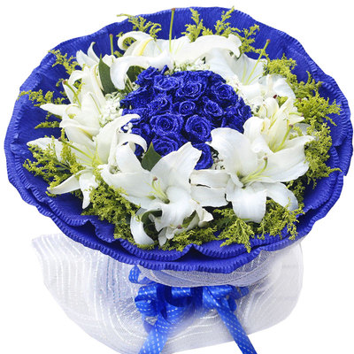 精选19枝蓝玫瑰,8朵白百合,黄莺间插
