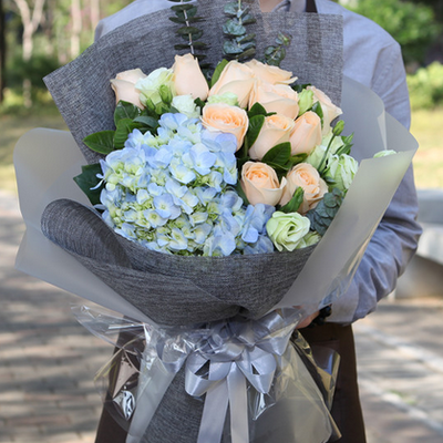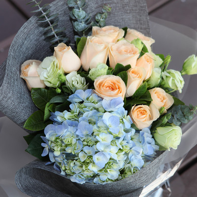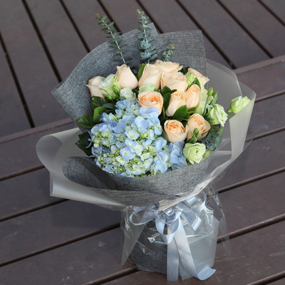 11朵香槟玫瑰,9朵桔梗,1朵蓝色绣球和尤加利叶搭配。