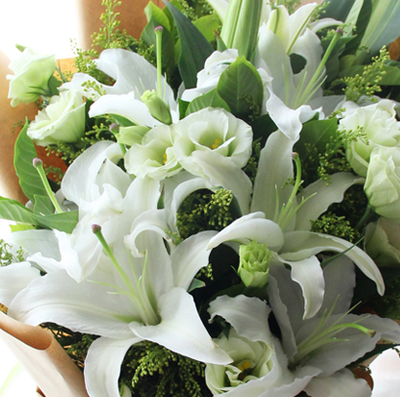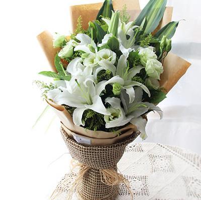 8支白色多头百合,桔梗、黄莺、栀子叶搭配。