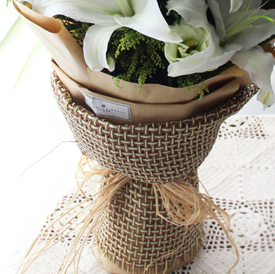黄色纸扇形包装、W纸外围包扎,拉菲草蝴蝶结。花语:感恩一路上有你的陪伴附送: