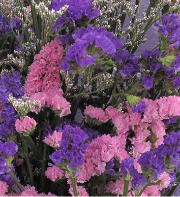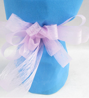 浅紫色平面纸垫底,蓝色+白色平面纸扇形包装,浅紫色丝带束扎。花语:勿忘我是从英文名称附送: