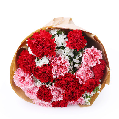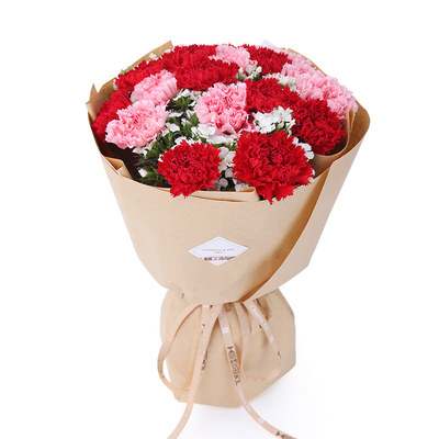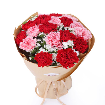 9朵红色康乃馨,10朵粉色康乃馨,白色相思梅围边