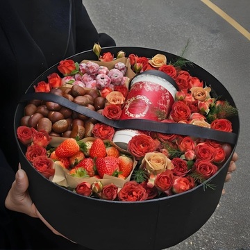 4朵香槟玫瑰,若干巧克力泡泡,绿叶,草莓、板栗、糖炒山楂、奶茶等搭配