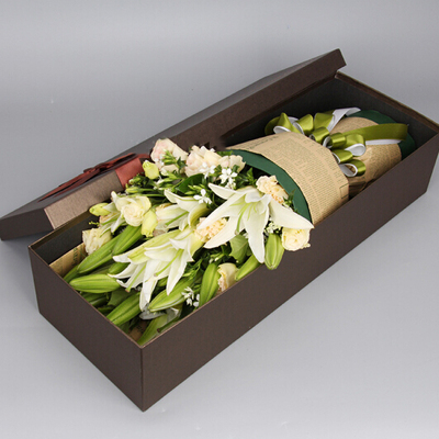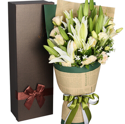 英文报纸加墨绿色包装纸,白色加绿色缎带系蝴蝶结束扎,咖啡色礼盒精美包装。花语:因为你我懂得了爱附送: