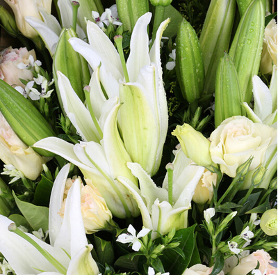 16朵白百合,白色相思梅、香槟色桔梗搭配。