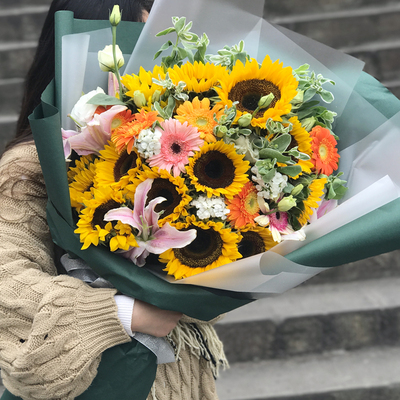 14支向日葵,8朵非洲菊(粉色和橘色混搭),3朵粉百合,2枝白桔梗,白色相思梅点缀,高山积雪丰满间插