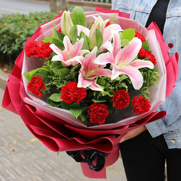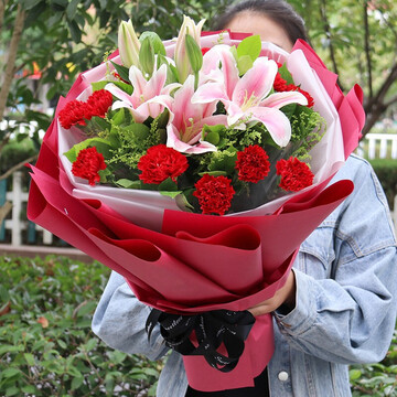 精选19朵红色康乃馨,2枝多头百合,搭配满天星、绿叶。