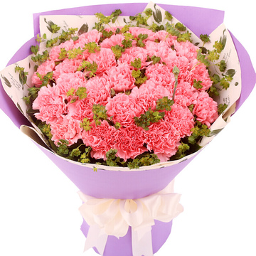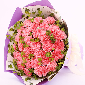 33朵粉色康乃馨,叶上黄金(或栀子叶)搭配