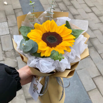 1朵向日葵,搭配适量绿叶及配草丰满装饰。