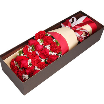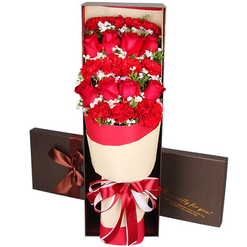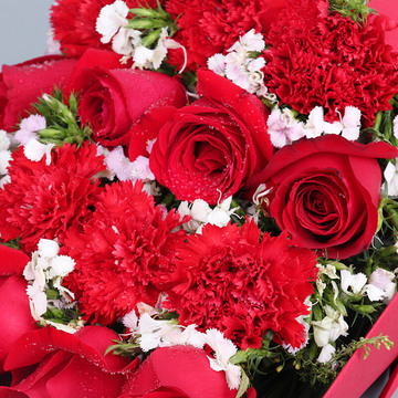 11朵红色康乃馨,8朵红玫瑰,黄莺点缀,石竹梅间插。