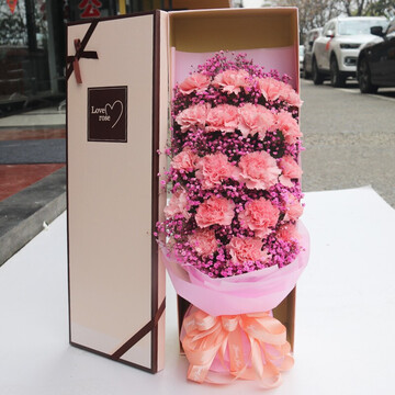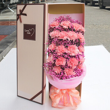 粉色包装,长方形礼盒装花语:念母恩,比海深;今生情,无以报;母亲节,表心声;愿母亲,永年轻;精神好,气色正;身体好,无病疾;心情好,无烦忧;享幸福,笑开颜!附送: